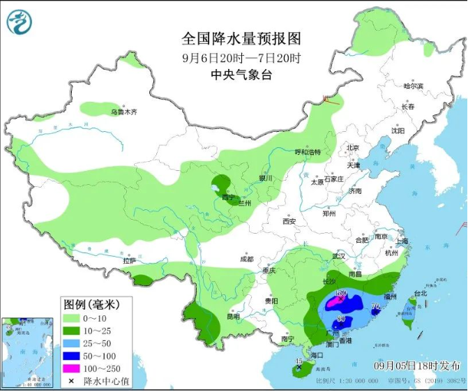 9月6日20时至7日20时,广东、福建、江西中南部、湖南东南部、广西东部、台湾岛等地有中到大雨,其中,广东中东部、福建南部、江西南部、湖南东南部等地的部分地区有暴雨到大暴雨(100~150毫米)。内蒙古东部的部分地区有4~6级风。