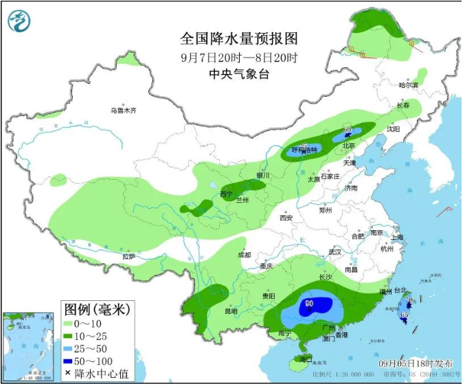 9月7日20时至8日20时,广东、福建南部、江西南部、湖南南部、广西中东部以及台湾岛等地有中到大雨,其中,广东北部、湖南西南部、广西东北部等地的部分地区有暴雨(50~100毫米)。内蒙古东部、黑龙江东部等地的部分地区有4~6级风。